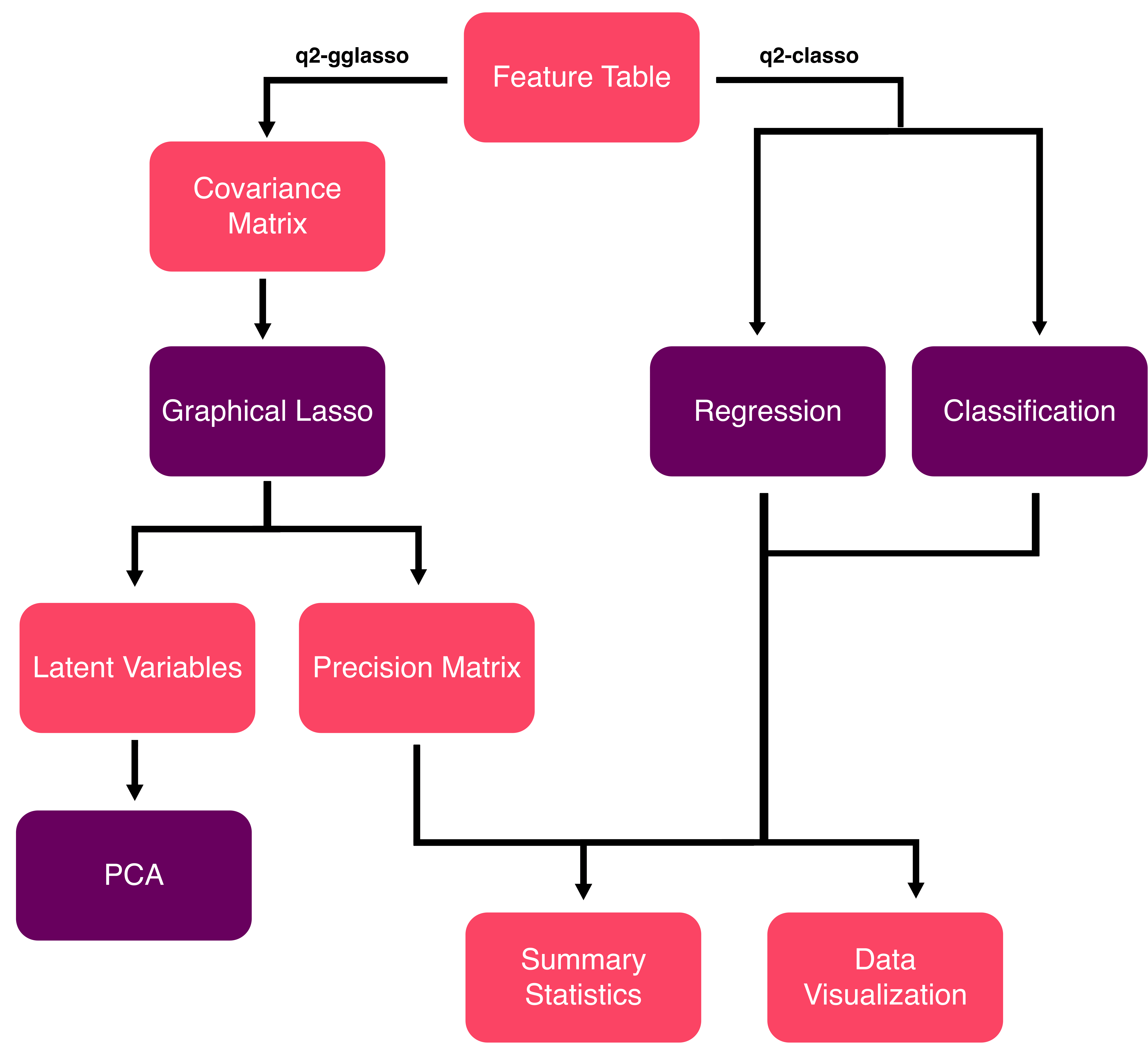 The pipeline depicted above outlines the functionality implemented in two QIIME2 plugins namely q2-gglasso for network learning and q2-classo for regression and classification tasks. Together, these plugins address gaps in the existing functionality within QIIME2, offering: